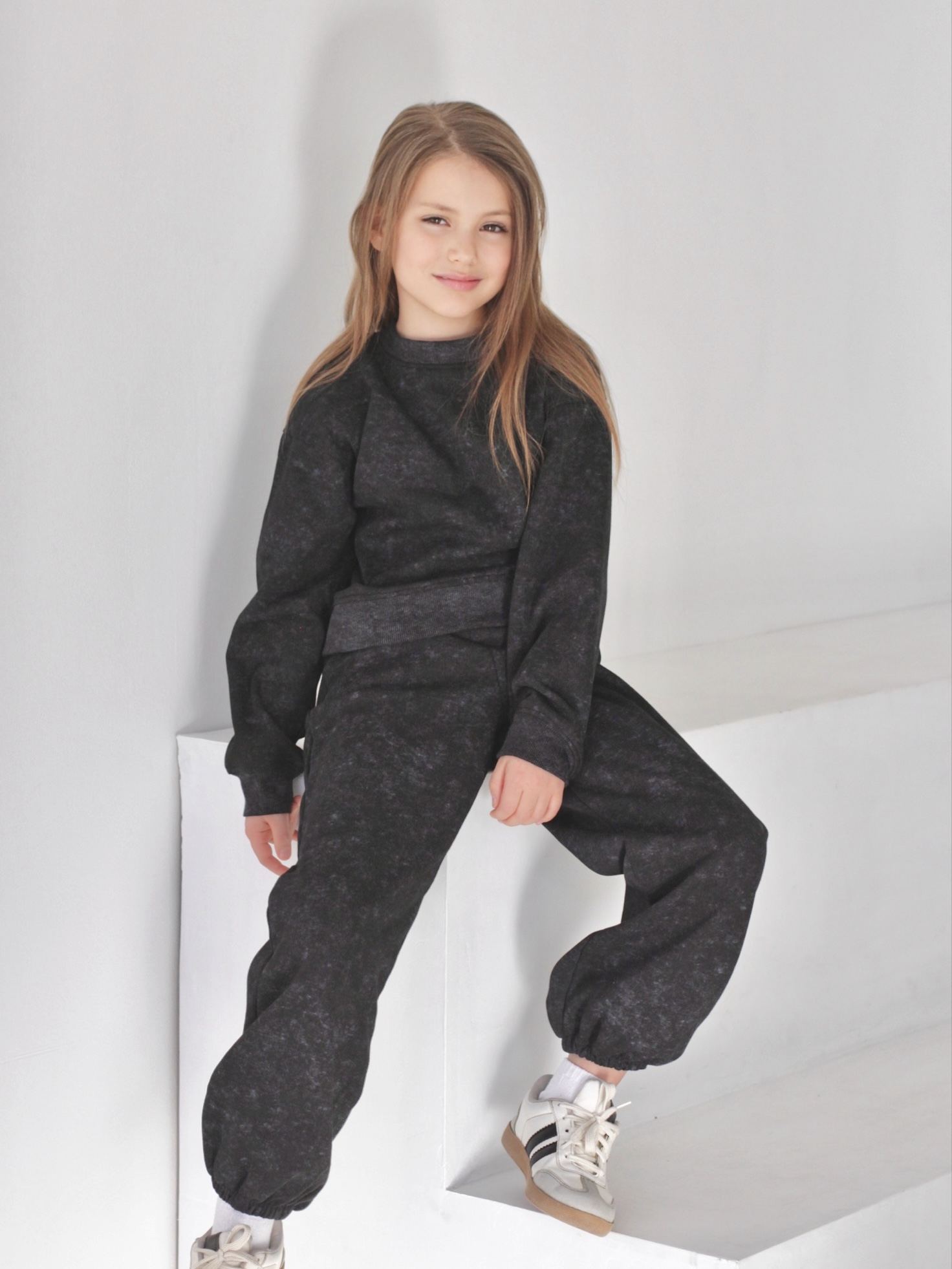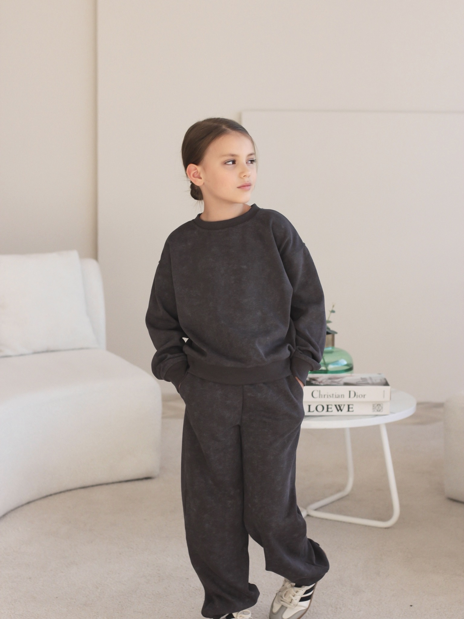 Спортивный костюм для девочки из футера "варёнки", очень комфортный, универсальный и стильный. Простая и удобная база на каждый день. Стильный оверсайз крой. В нем удобно ходить на физкультуру, гулять и даже носить в школу.