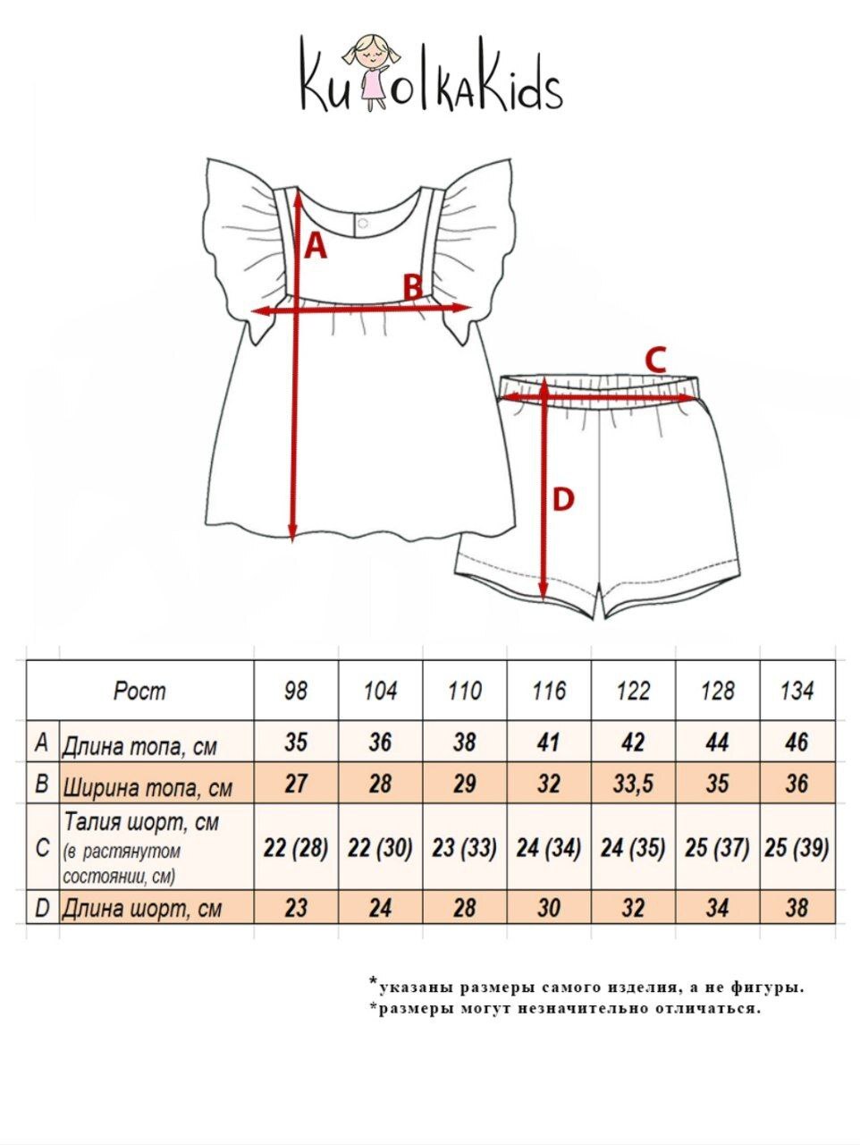 Комплект состоит из шортиков и топа. Топ свободный, сзади застегивается на пуговки.