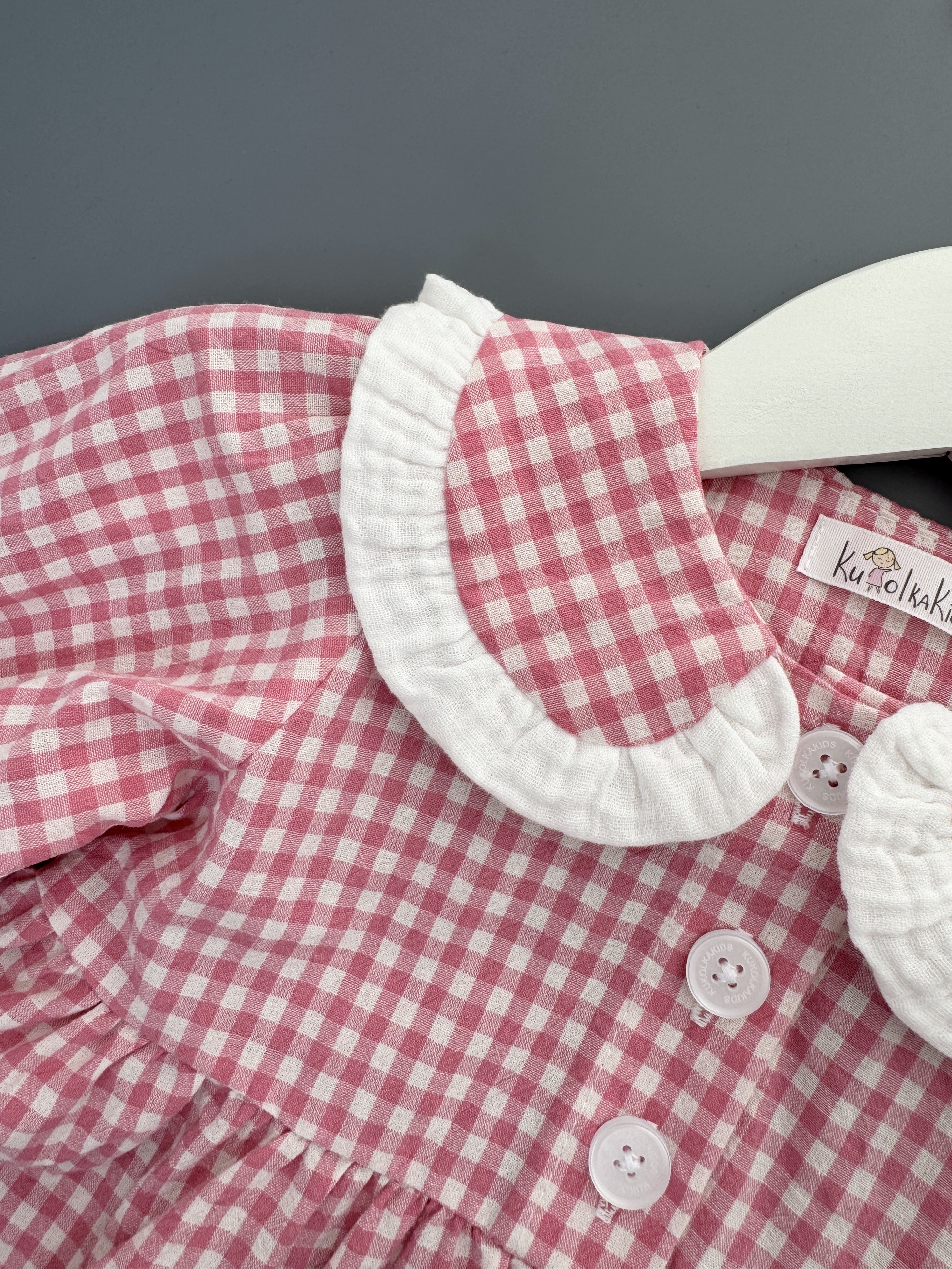Детали: двойной воротничок с рюшей из белого муслина придаёт кукольное очарование.