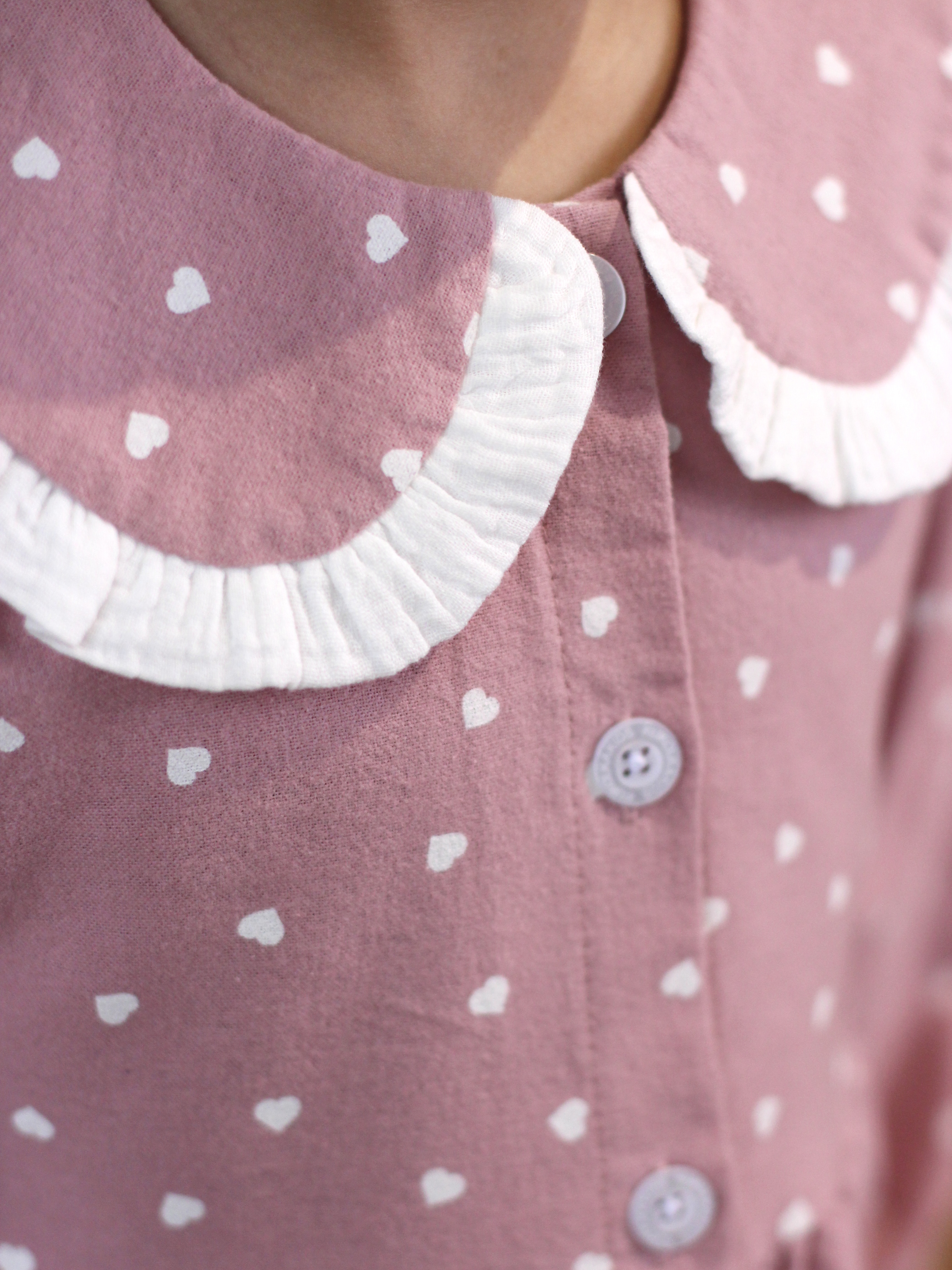 Детали: двойной воротничок с рюшей из белого муслина придаёт кукольное очарование.