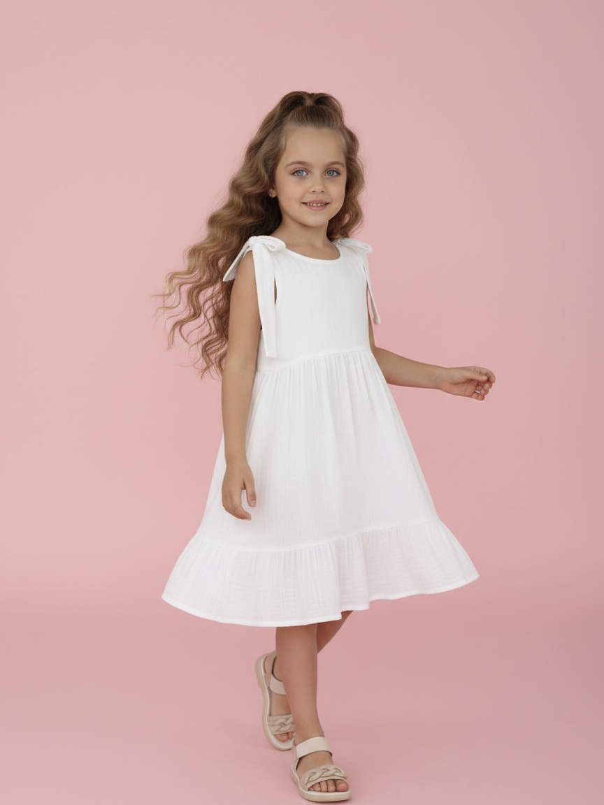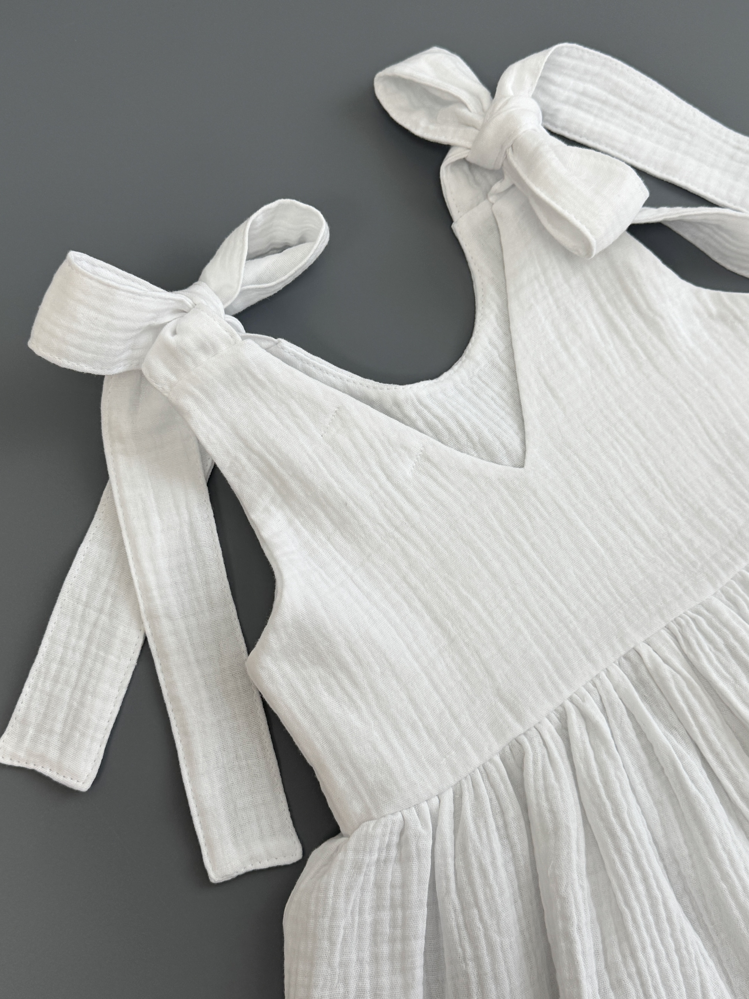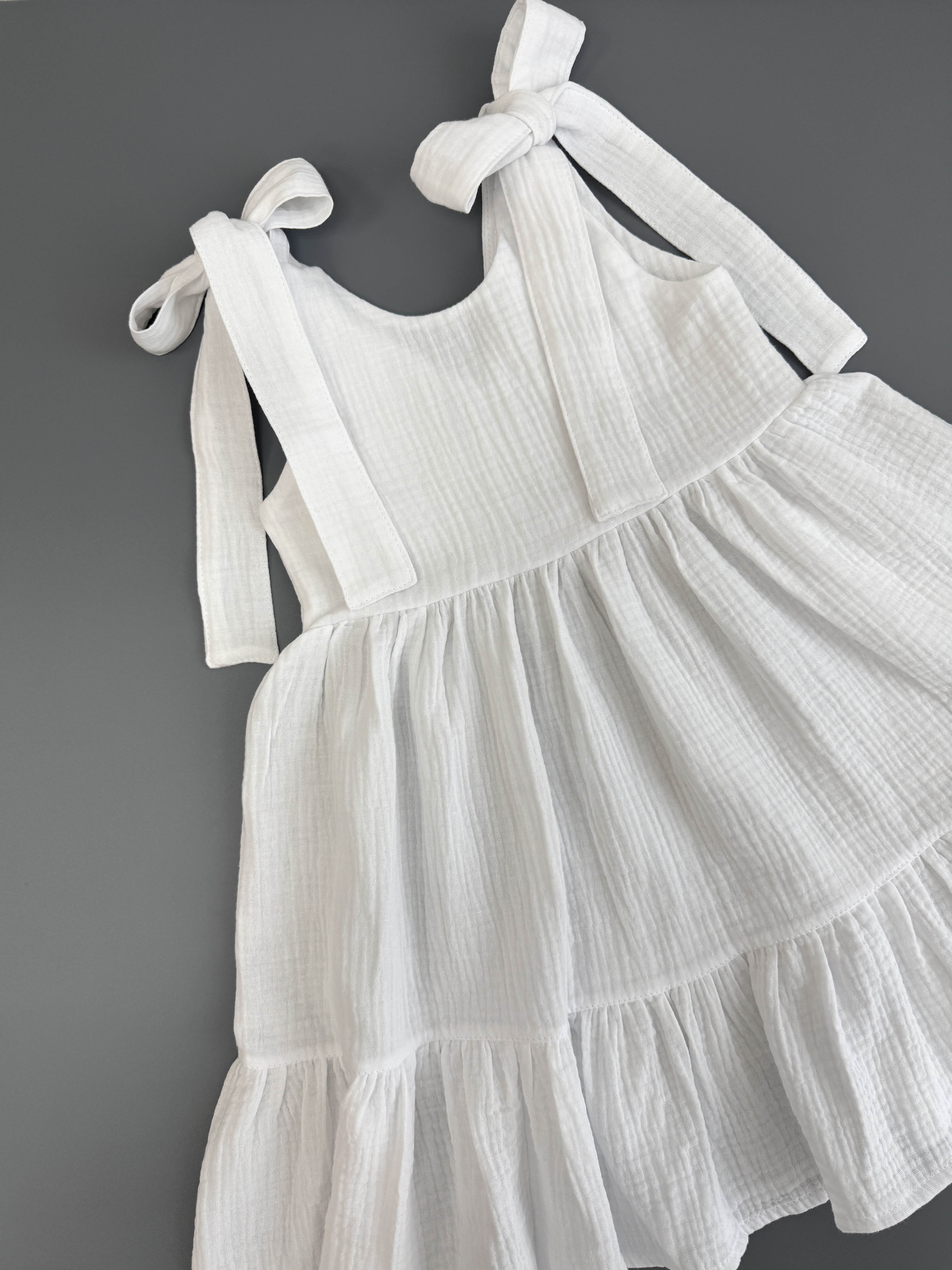 В легком муслиновом сарафане благодаря натуральному составу не жарко летом. Летнее платье комфортного кроя с ленточками на плечах, с помощью которых можно регулировать длину платья. Идеально подойдет для отпуска на море, для летних прогулок, садика, на утренник и на День рождения.