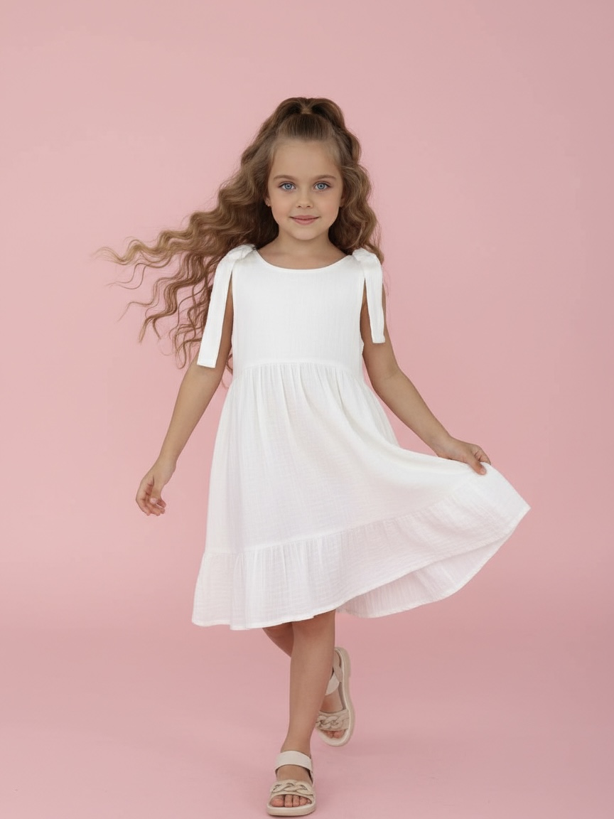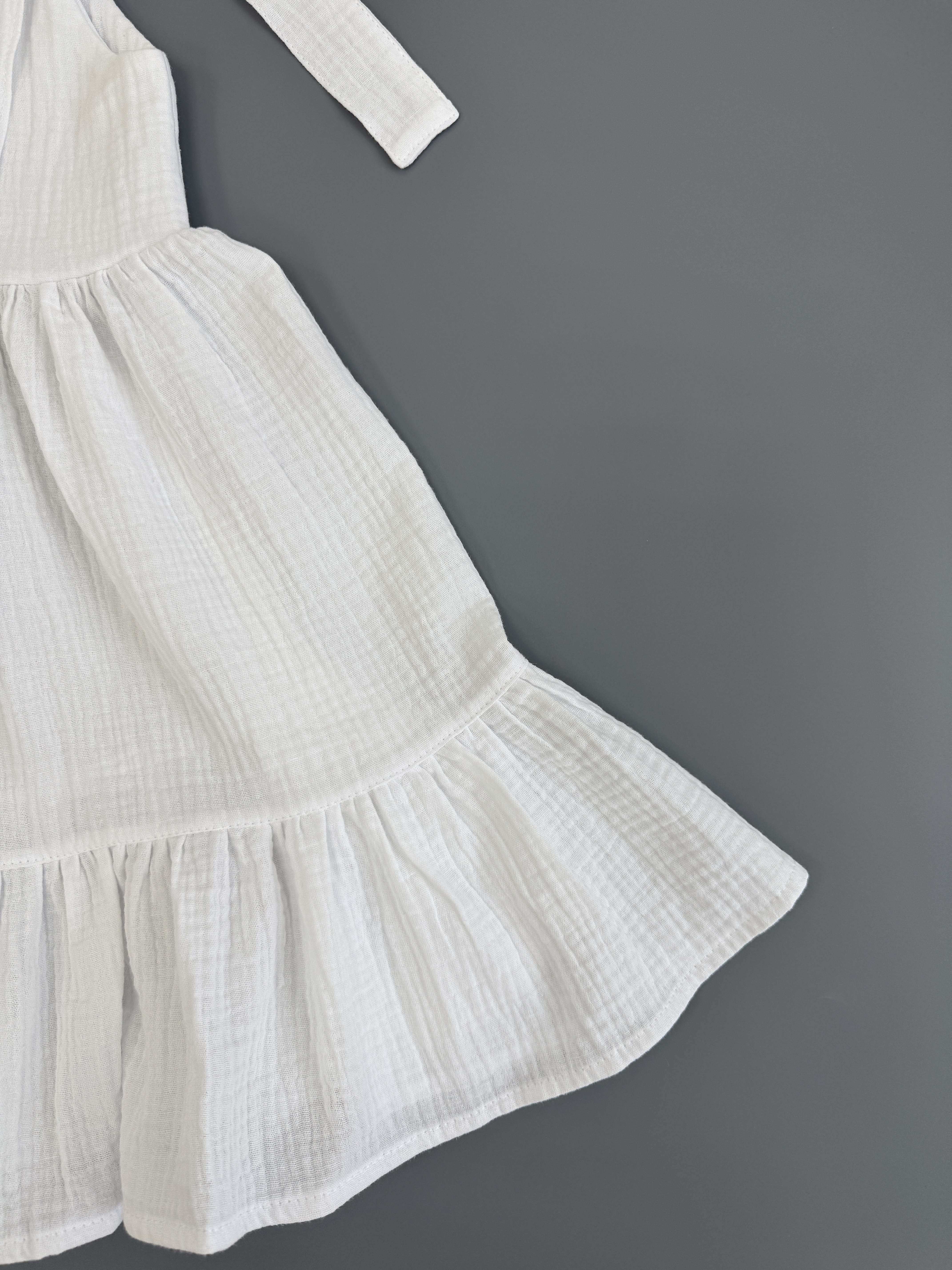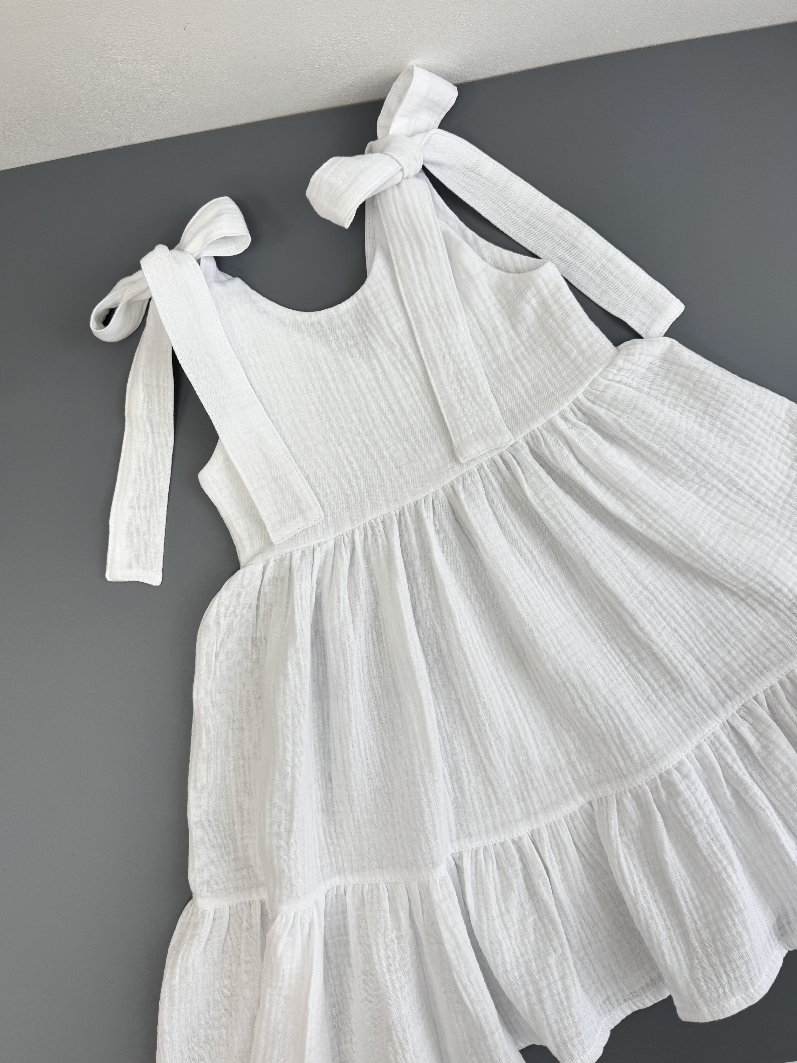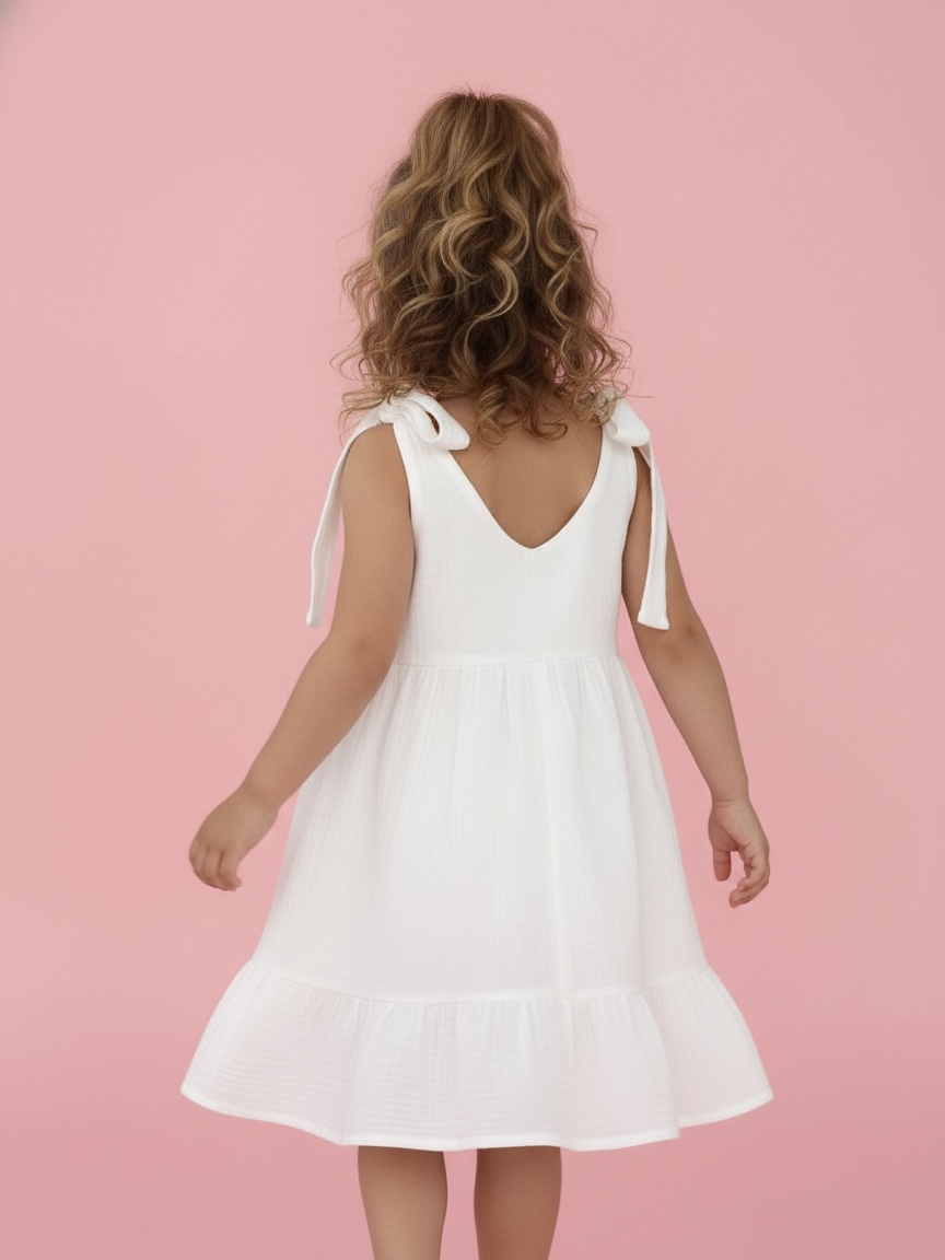 В легком муслиновом сарафане благодаря натуральному составу не жарко летом. Летнее платье комфортного кроя с ленточками на плечах, с помощью которых можно регулировать длину платья. Идеально подойдет для отпуска на море, для летних прогулок, садика, на утренник и на День рождения.