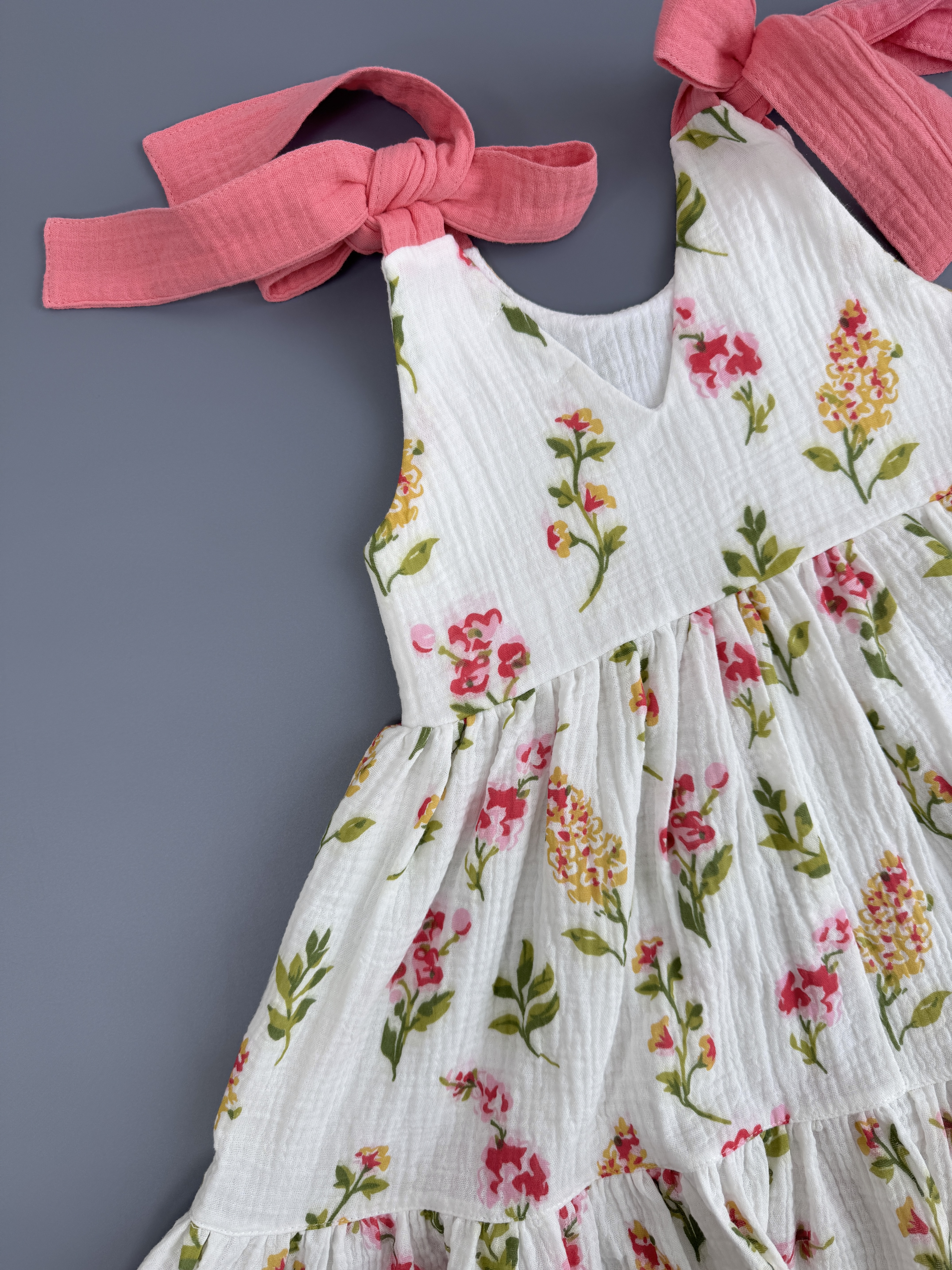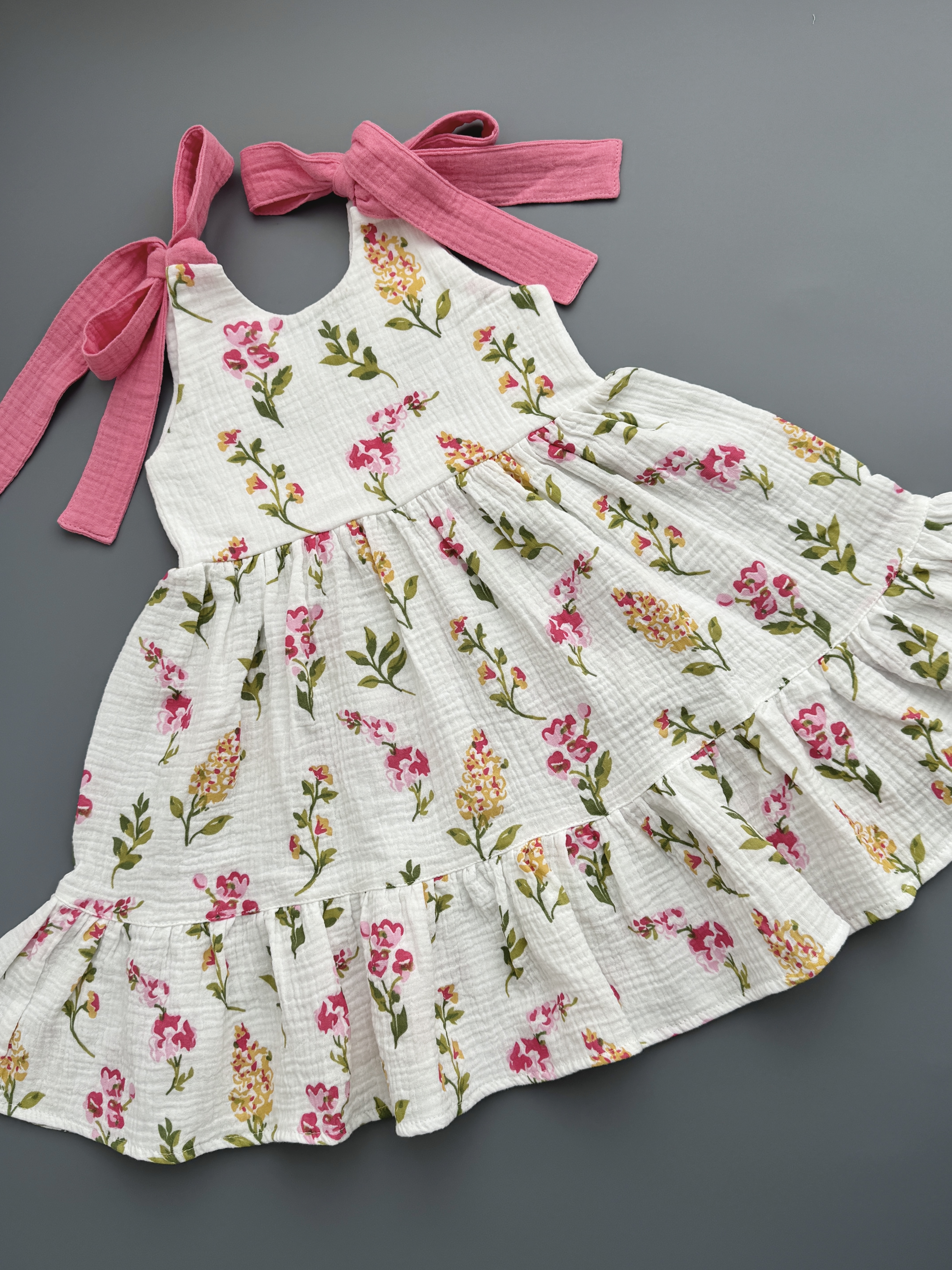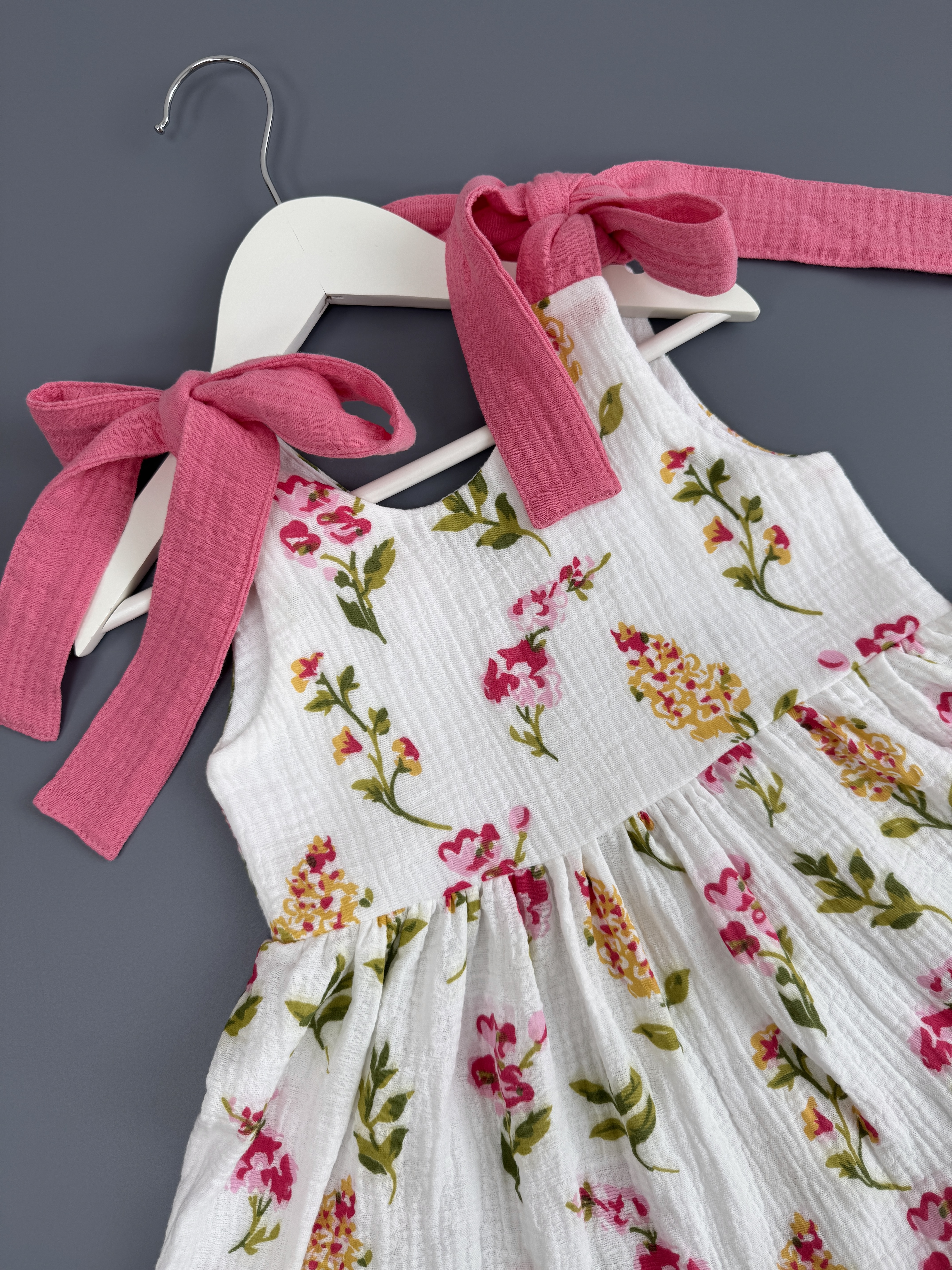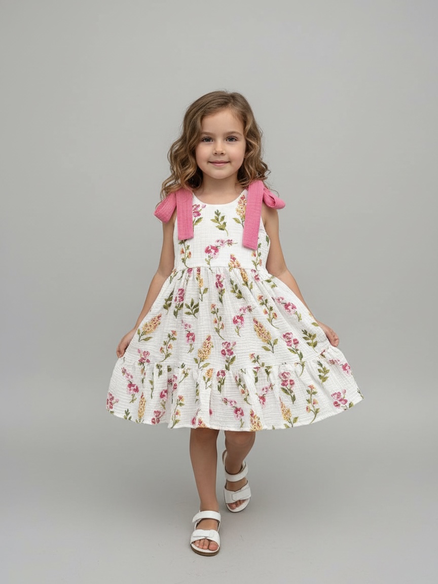 В легком муслиновом сарафане благодаря натуральному составу не жарко летом. Летнее платье комфортного кроя с ленточками на плечах, с помощью которых можно регулировать длину платья. Идеально подойдет для отпуска на море, для летних прогулок, садика, на утренник и на День рождения.