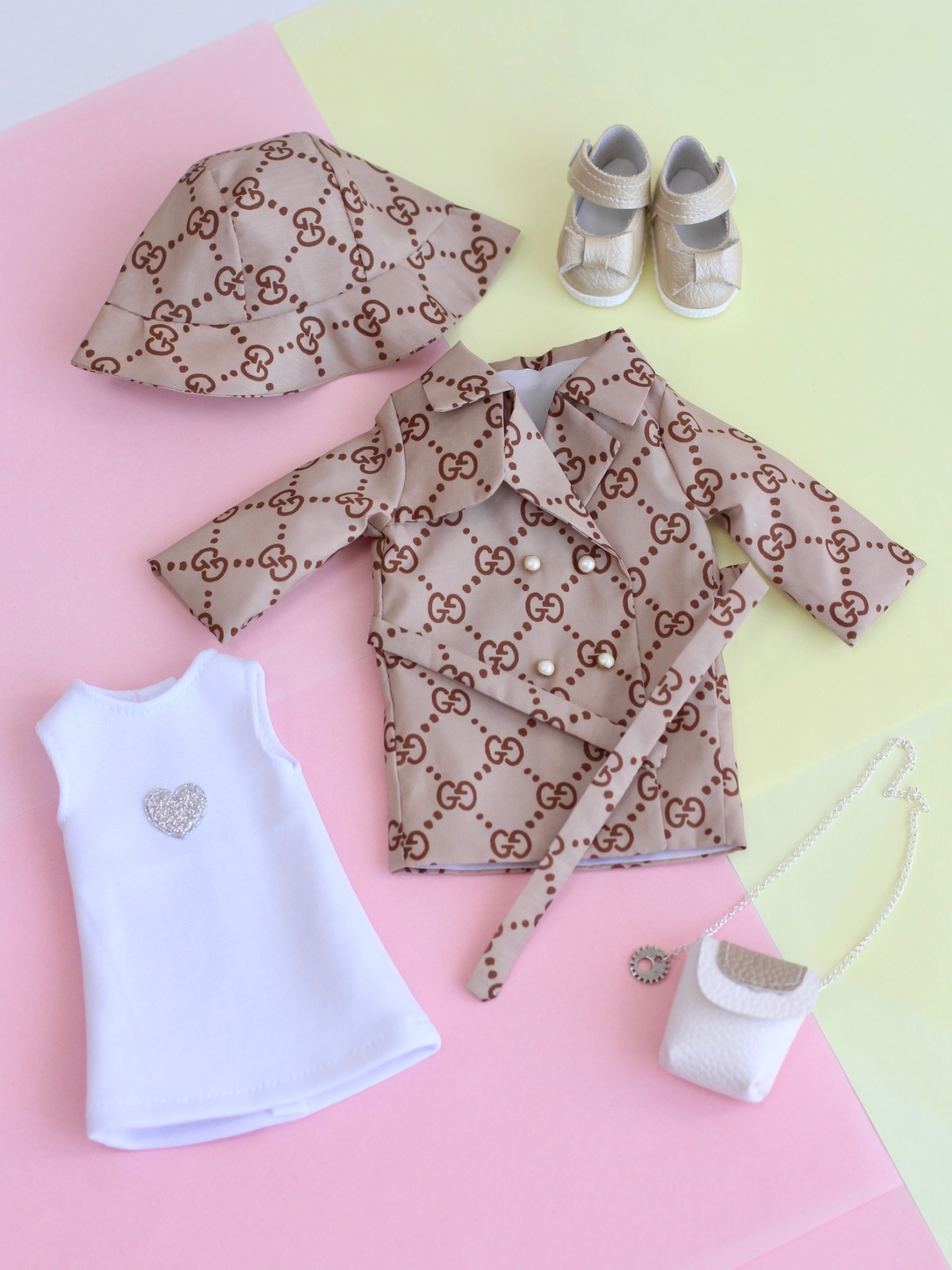 Стильный плащ с панамой, белое платье, сумочка и туфли на застёжке для куклы Paola Reina 32-34 см